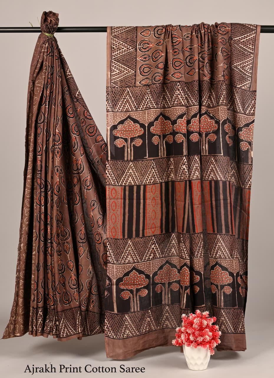 Ajrakh Cotton Saree with Ethnic Patterns