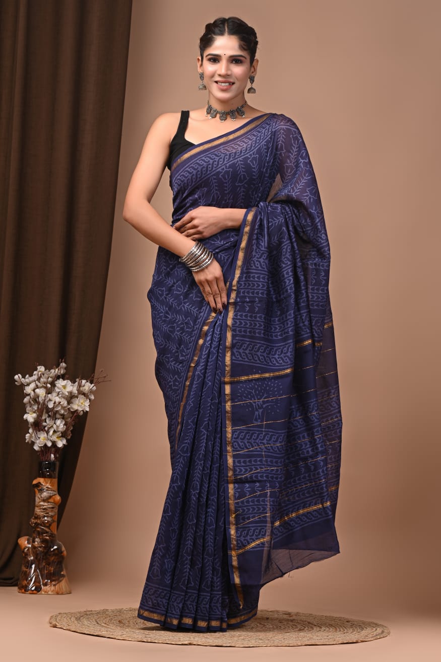 Bagru hand block printing is a traditional Rajasthani printing technique where artisans use hand-carved wooden blocks and natural dyes to create intricate patterns on fabric. Each saree is handmade, making every piece unique.