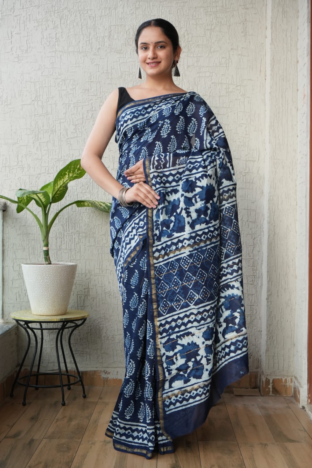 Bagru hand block printing is a traditional Rajasthani printing technique where artisans use hand-carved wooden blocks and natural dyes to create intricate patterns on fabric. Each saree is handmade, making every piece unique.
