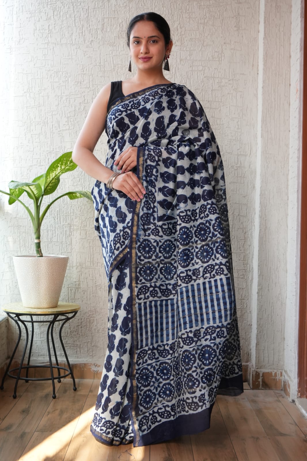 Bagru hand block printing is a traditional Rajasthani printing technique where artisans use hand-carved wooden blocks and natural dyes to create intricate patterns on fabric. Each saree is handmade, making every piece unique.