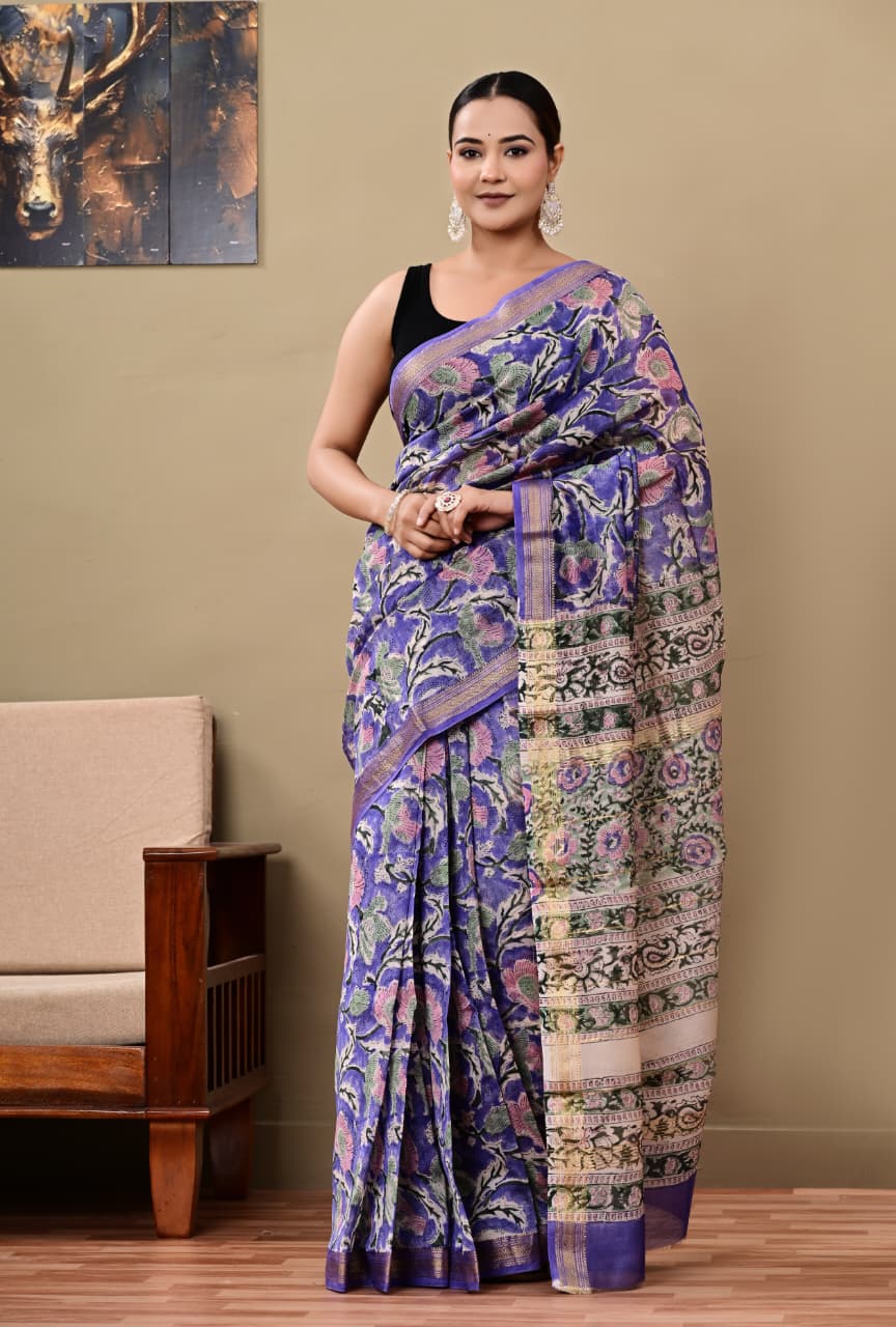 No digital or machine printing is used. The subtle variations in color and motifs are a mark of authentic handcrafted work and make each saree unique.