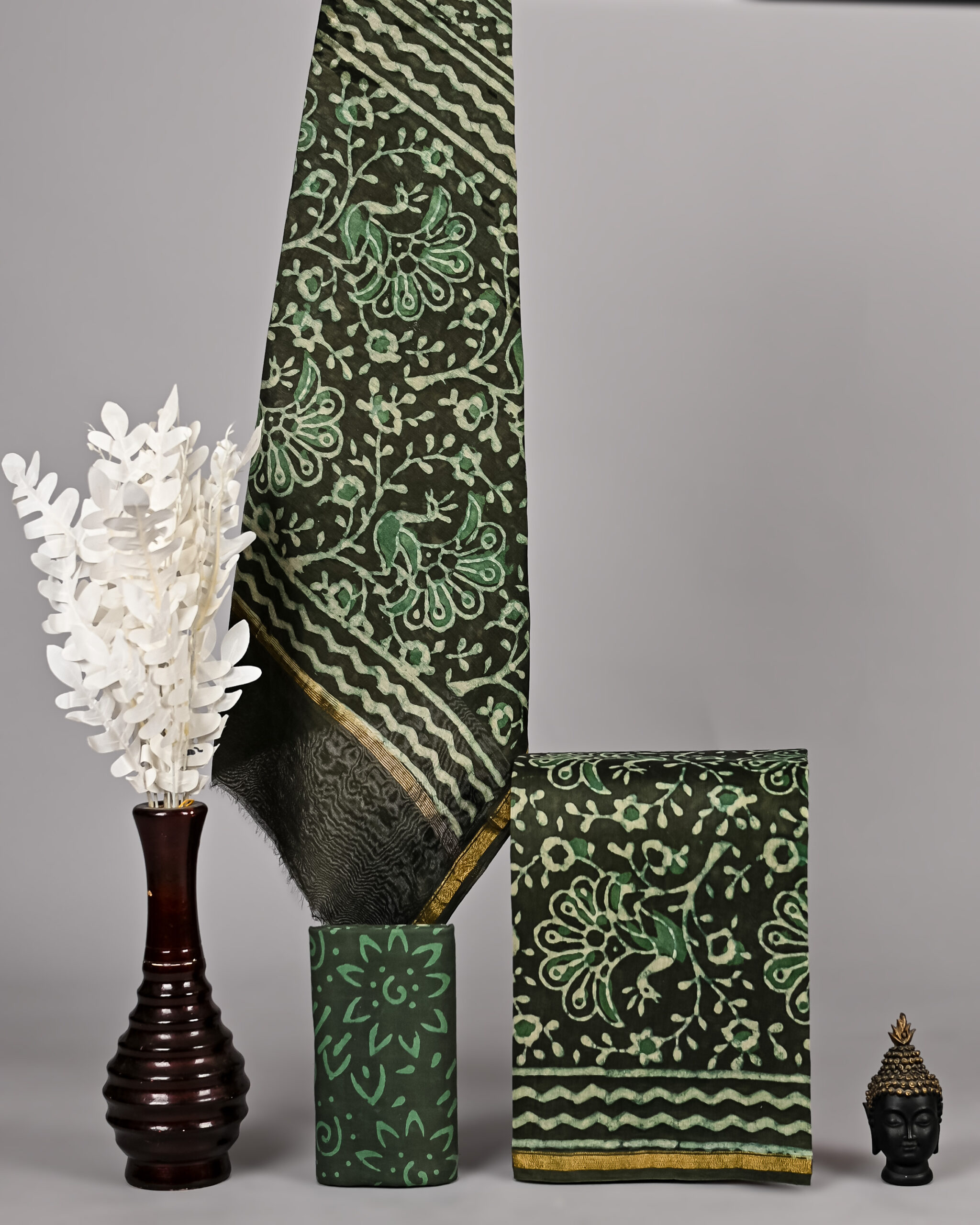 An artisan-made Chanderi silk suit hand block printed or hand painted with natural dyes. Soft, breathable, and gracefully elegant for office and festive wear.