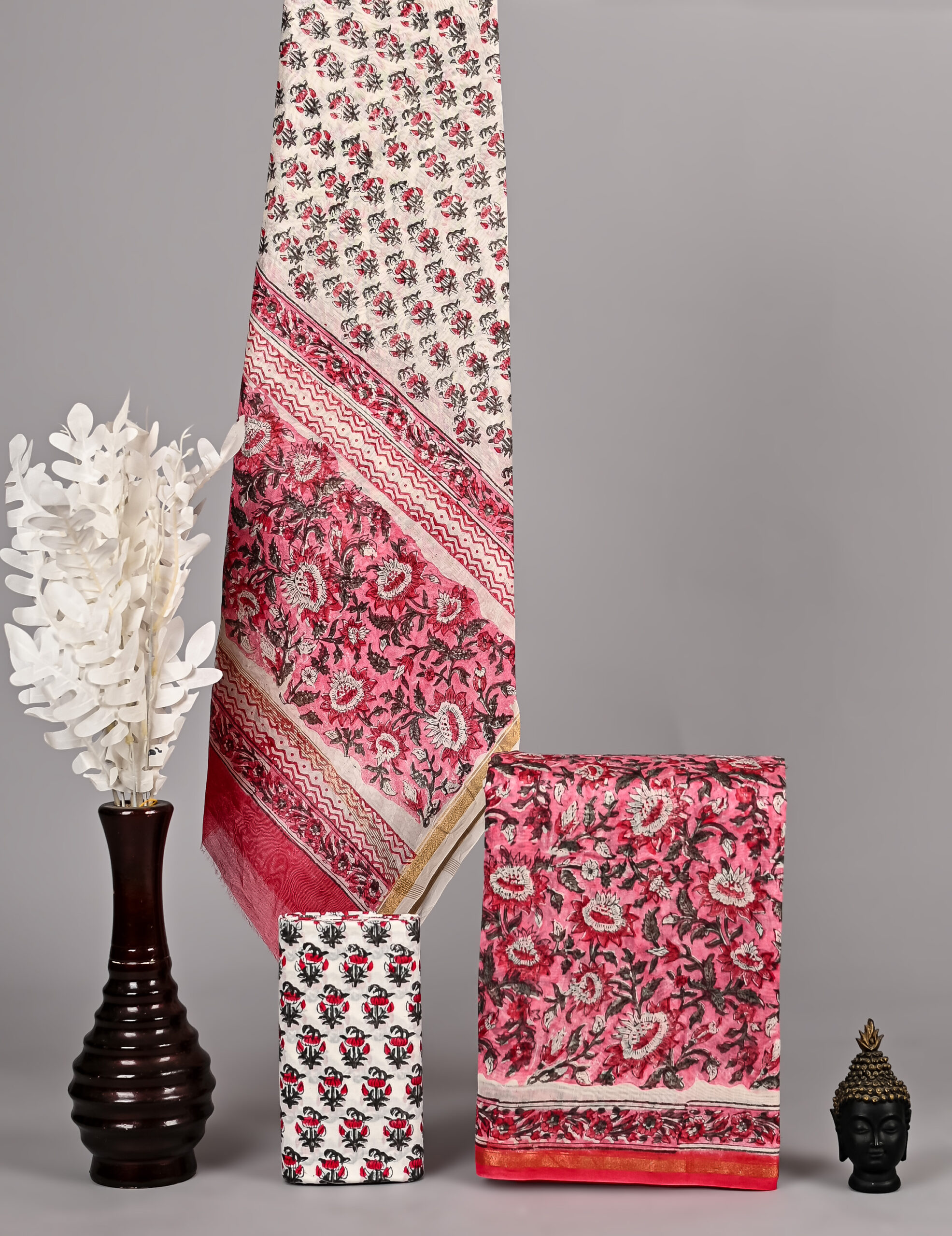 An artisan-made Chanderi silk suit hand block printed or hand painted with natural dyes. Soft, breathable, and gracefully elegant for office and festive wear.