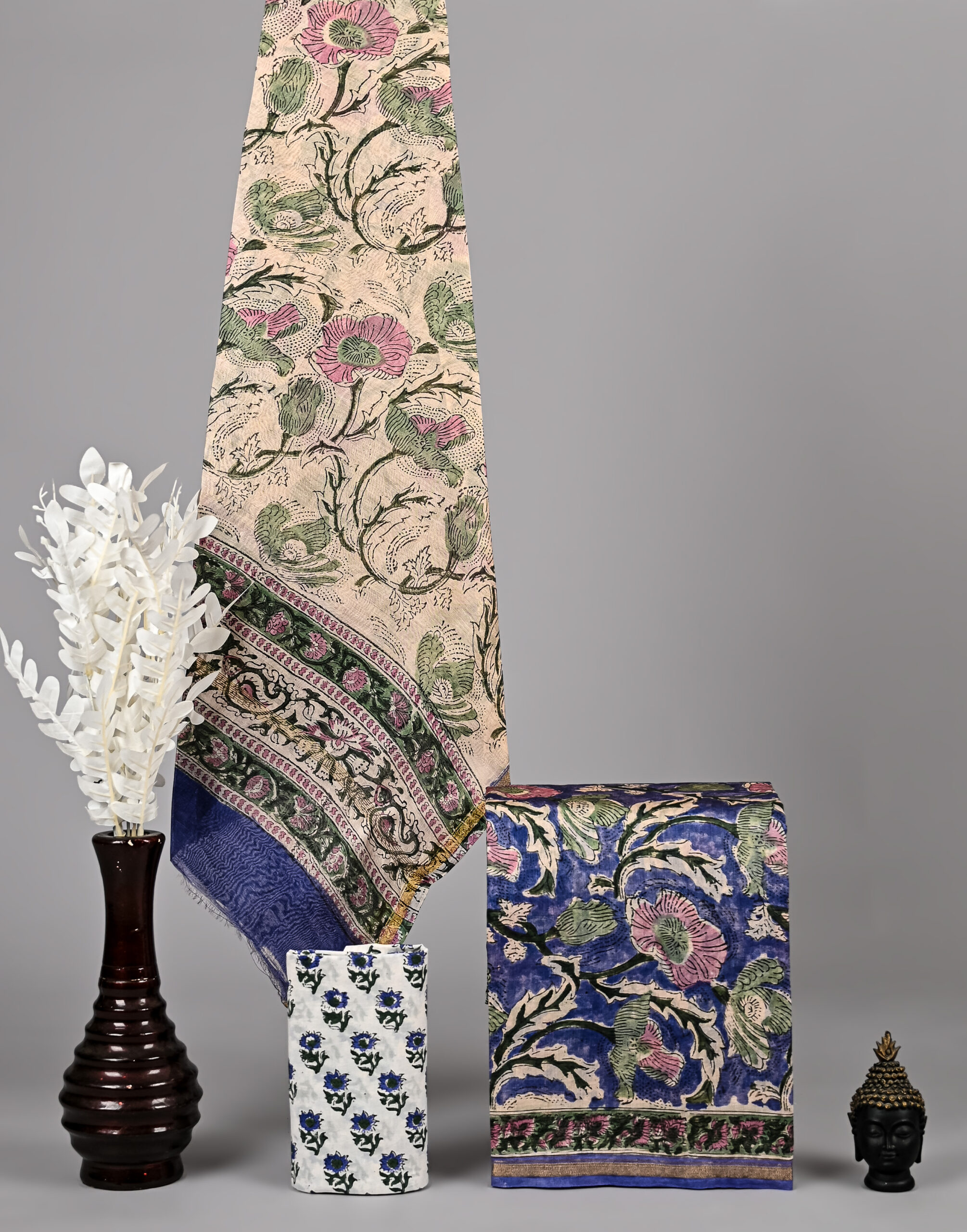 An artisan-made Chanderi silk suit hand block printed or hand painted with natural dyes. Soft, breathable, and gracefully elegant for office and festive wear.