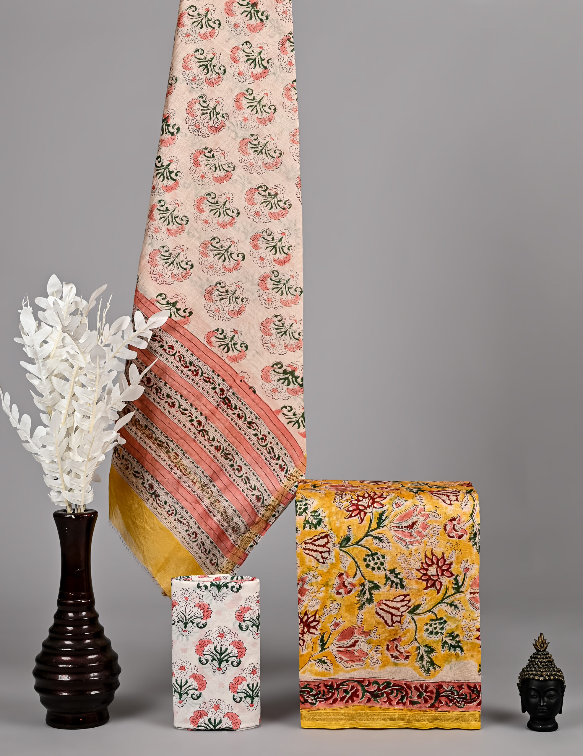 An artisan-made Chanderi silk suit hand block printed or hand painted with natural dyes. Soft, breathable, and gracefully elegant for office and festive wear.