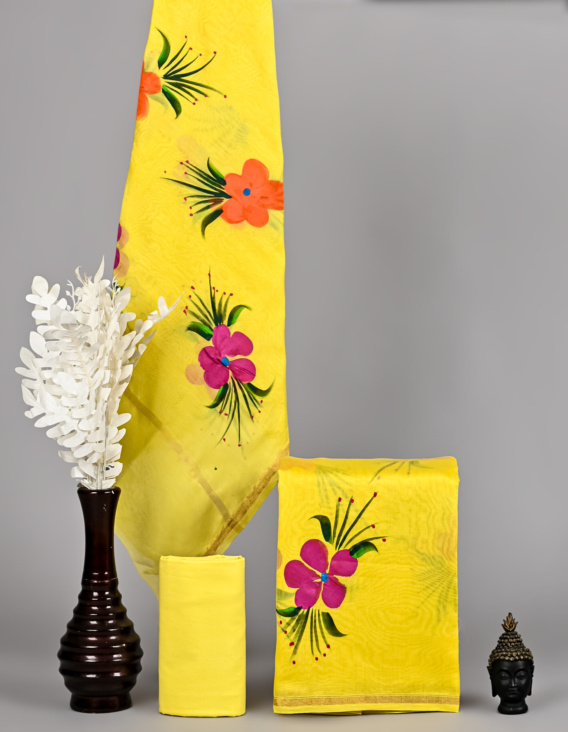 An artisan-made Chanderi silk suit hand block printed or hand painted with natural dyes. Soft, breathable, and gracefully elegant for office and festive wear.