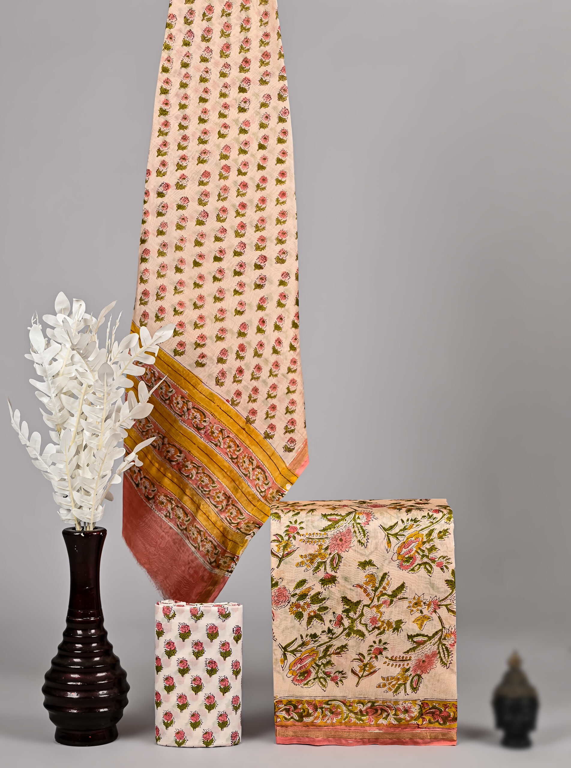 An artisan-made Chanderi silk suit hand block printed or hand painted with natural dyes. Soft, breathable, and gracefully elegant for office and festive wear.