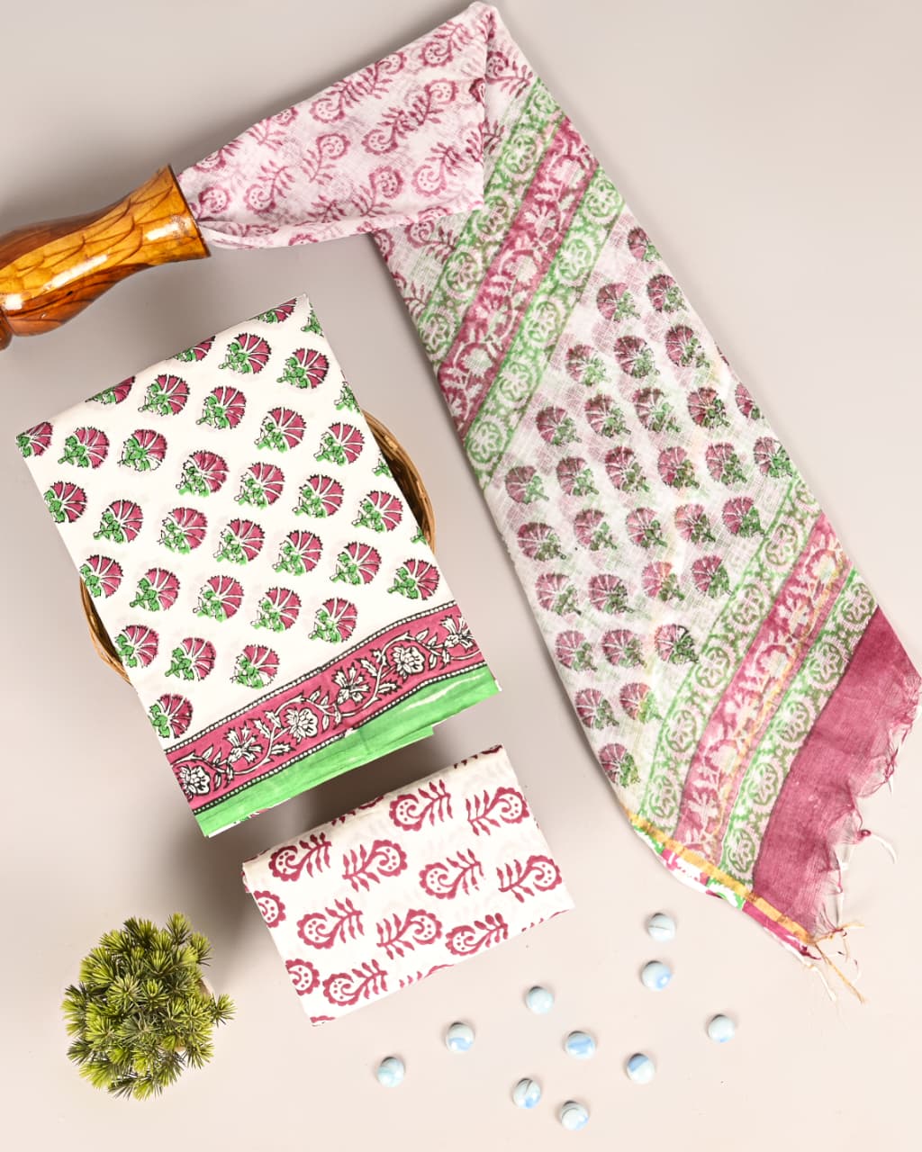 Hand Block Printed Cotton Suit Set with Kota Doria Dupatta