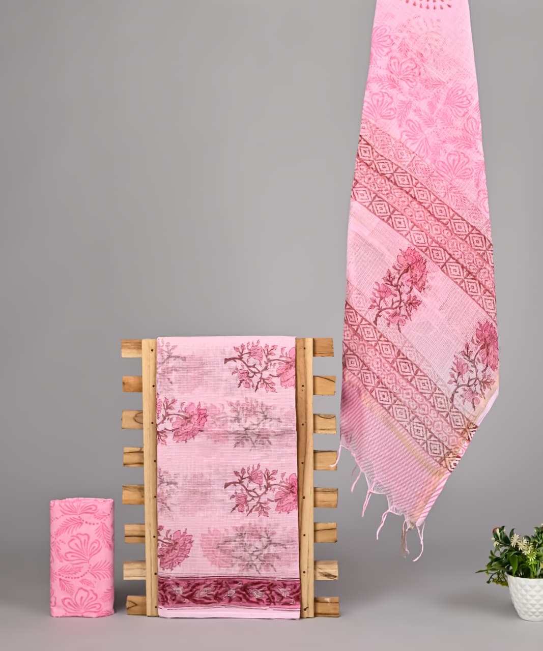Each suit piece is hand block printed in Bagru, a centuries-old printing technique from Rajasthan. Skilled artisans carefully carve intricate designs onto wooden blocks and hand stamp them onto the fabric using eco-friendly colors. Because the printing process is entirely manual, every piece carries slight variations that highlight the authenticity and uniqueness of handcrafted textiles.