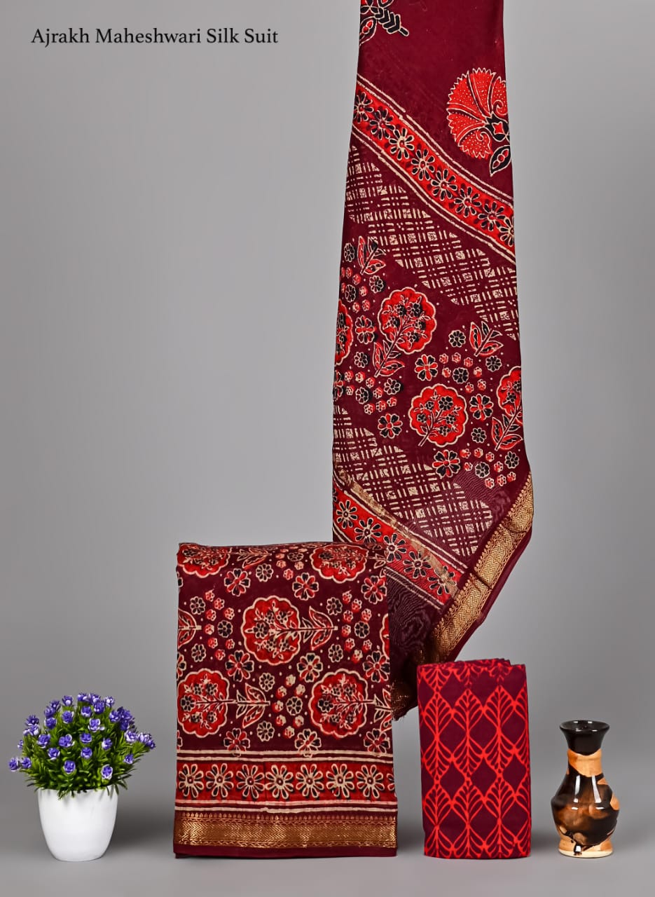 This Maheshwari silk suit is crafted by skilled artisans who have inherited the art of handloom weaving through generations. Every piece is made with patience and precision, reflecting the weaver’s expertise and dedication. Slight irregularities in weave or print are not flaws but hallmarks of authentic handcraft, making each suit truly one of a kind.
