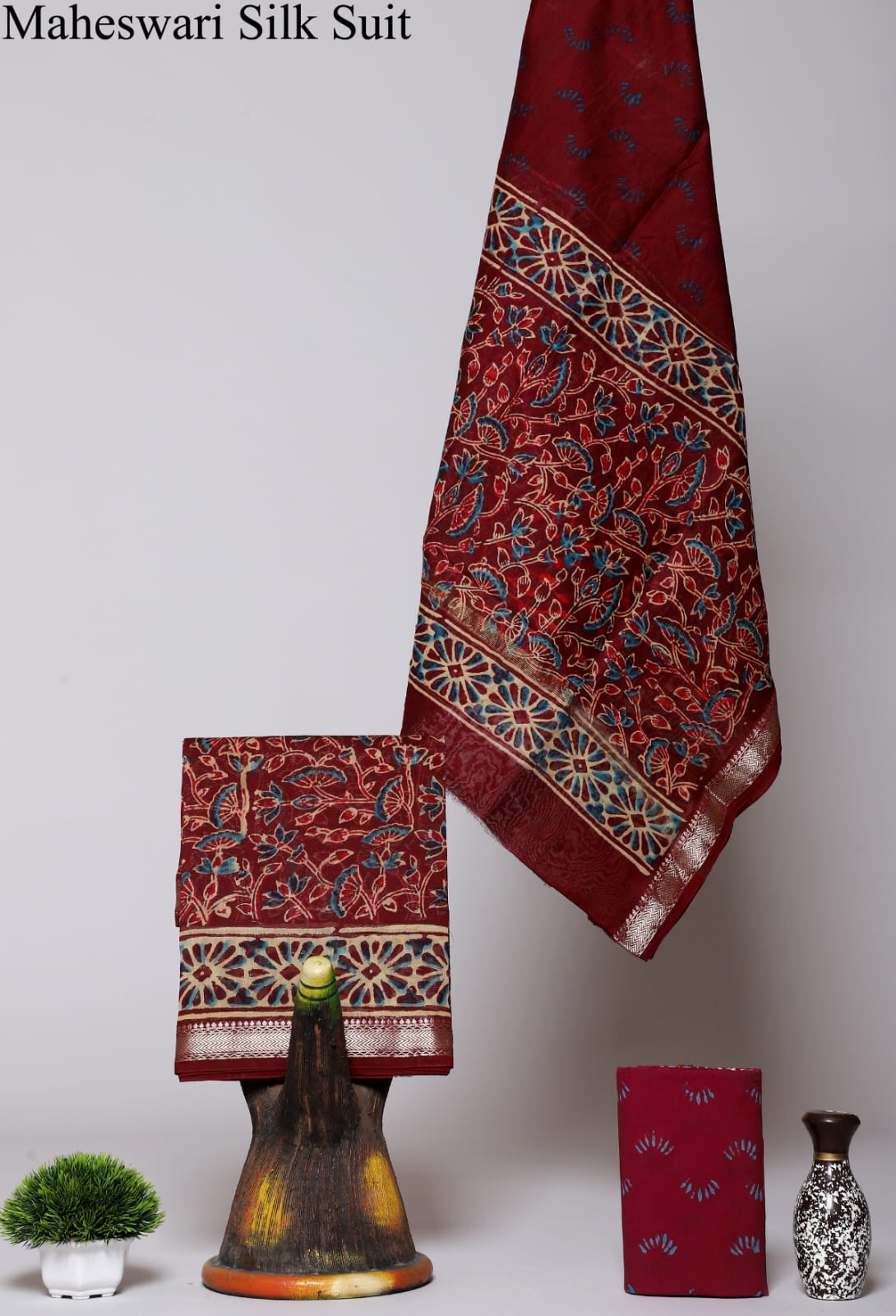 This Maheshwari silk suit is crafted by skilled artisans who have inherited the art of handloom weaving through generations. Every piece is made with patience and precision, reflecting the weaver’s expertise and dedication. Slight irregularities in weave or print are not flaws but hallmarks of authentic handcraft, making each suit truly one of a kind.